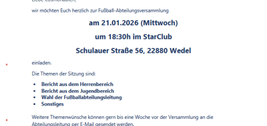 Es ist ruhig um die Schiedsrichterabteilung geworden, denn sie schnurrt und läuft wie ein Schweizer Uhrwerk. Unter der Leitung von Marc Liebert und Uwe Meyer sind wieder 14 Schiedsrichter gemeldet gewesen. Diese haben alle ihnen zugewiesenen Termine wahrgenommen, sodass der Hamburger Fussballverband nicht eine einzige Strafe verhängen konnte. Super Leistung, die zum positiven Ansehen unseres Vereins beigetragen hat.