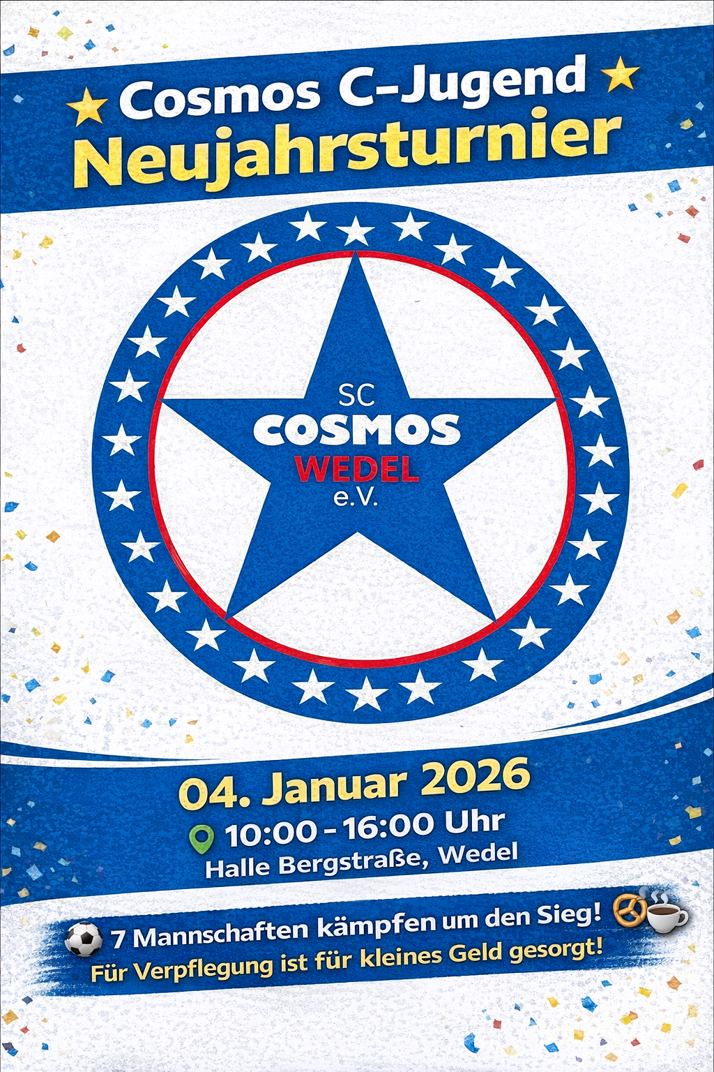 Am 04.01.2026 fand in der Halle Bergstraße das erste Cosmos Wedel C-Jugend Neujahrsturnier statt – ein gelungener Start ins neue Fußballjahr. Insgesamt sieben Mannschaften kämpften in spannenden und fairen Spielen um den Turniersieg und sorgten für eine tolle Atmosphäre auf und neben dem Spielfeld.
